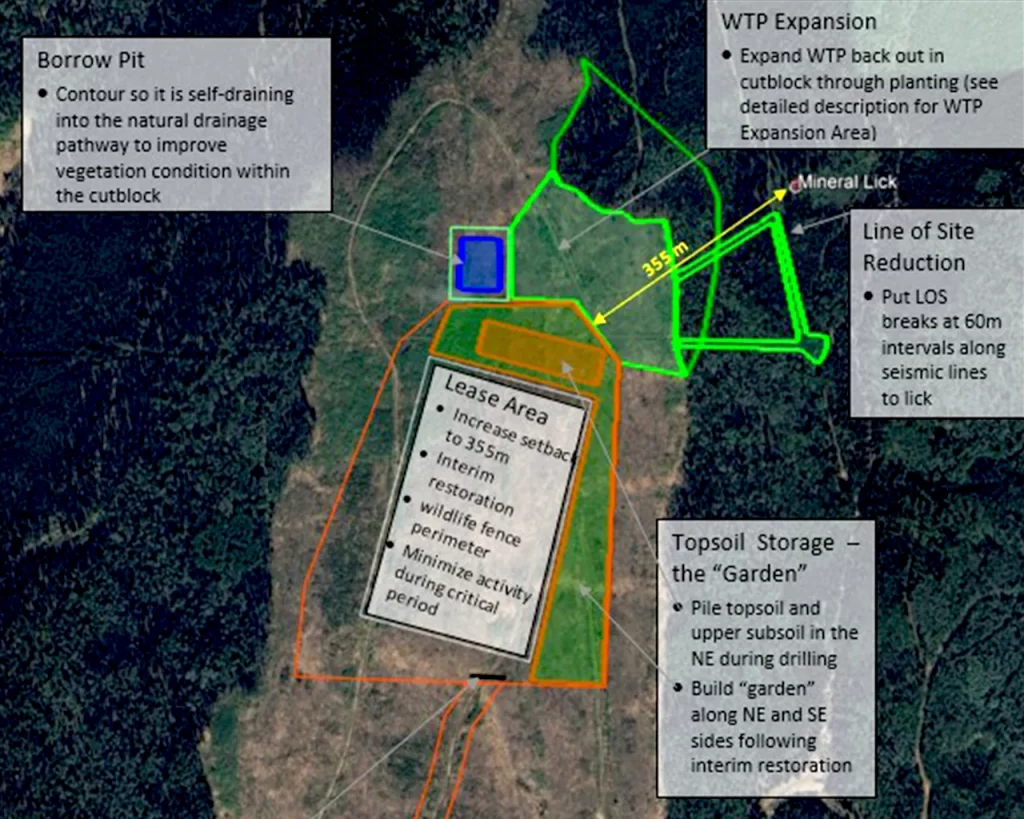 Eco-Web and the client’s primary strategy in reducing the impact of the proposed development on the mineral lick was to increase the setback and restore some of the habitat to improve the buffer and lines of sight around this wildlife habitat feature. While the client was able to modify the design enough to increase the setback an additional 100m from the original surface location, a 500m setback was not attainable without impacting the gas extraction design of the pad. The existing cutblock had already reduced the forested buffer around this feature to 190 m, so it was proposed to restore this buffer back to 355 m through the re-planting areas of the cutblock and other mitigation measures featured in Figure 1 for a faster restoration of the area to restore the forest values and benefits of visual screening and noise mitigation around the mineral lick.